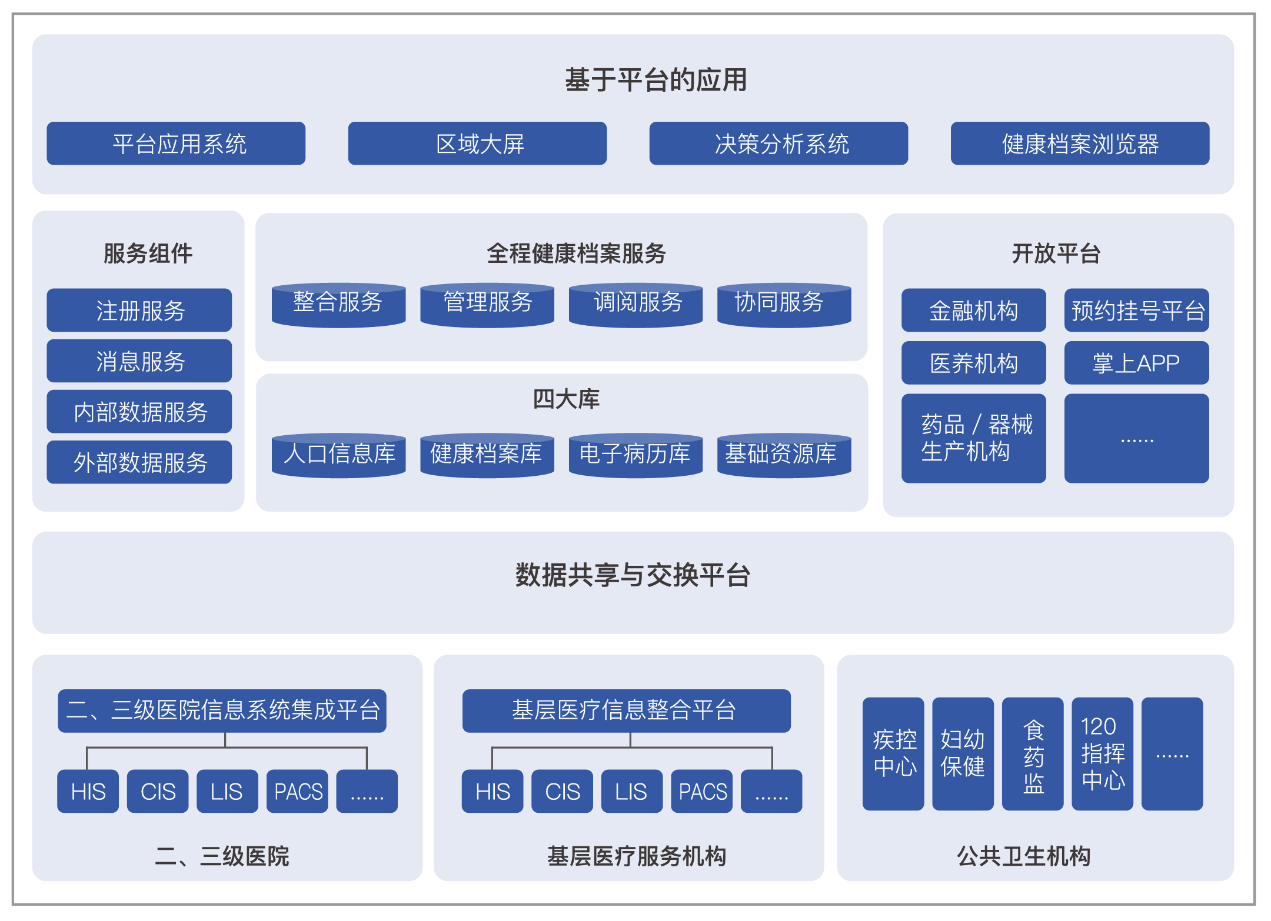 全民人口健康大数据平台根据国家关于全民健康信息平台的顶层设计,以“一大平台,四大资源库,八大协同应用”为建设思路,覆盖了各级医疗卫生、计生机构,以及卫生、财政、物价、卫监等有关政府部门的管理需求,并通过平台为百姓提供便民服务。一大平台指数据共享与交换平台;四大资源库指人口信息、健康档案、电子病历、基础资源数据库;八大协同应用指医疗协同服务应用、公共卫生管理应用、医疗保障应用、综合管理应用、药品管理应用、计划生育应用、分级诊疗应用以及信息惠民应用。构建城市级全民健康数据中心,为区域内社会公众提供分级的、连续的、安全的、便捷的医疗卫生信息云服务,提升基本医疗卫生服务的可靠性及公平性,促进形成有效的分级诊疗服务体系,优化区域医疗资源配置,提高医疗服务水平和医疗质量,降低医疗费用,提升卫生综合管理水平和政府综合决策能力。