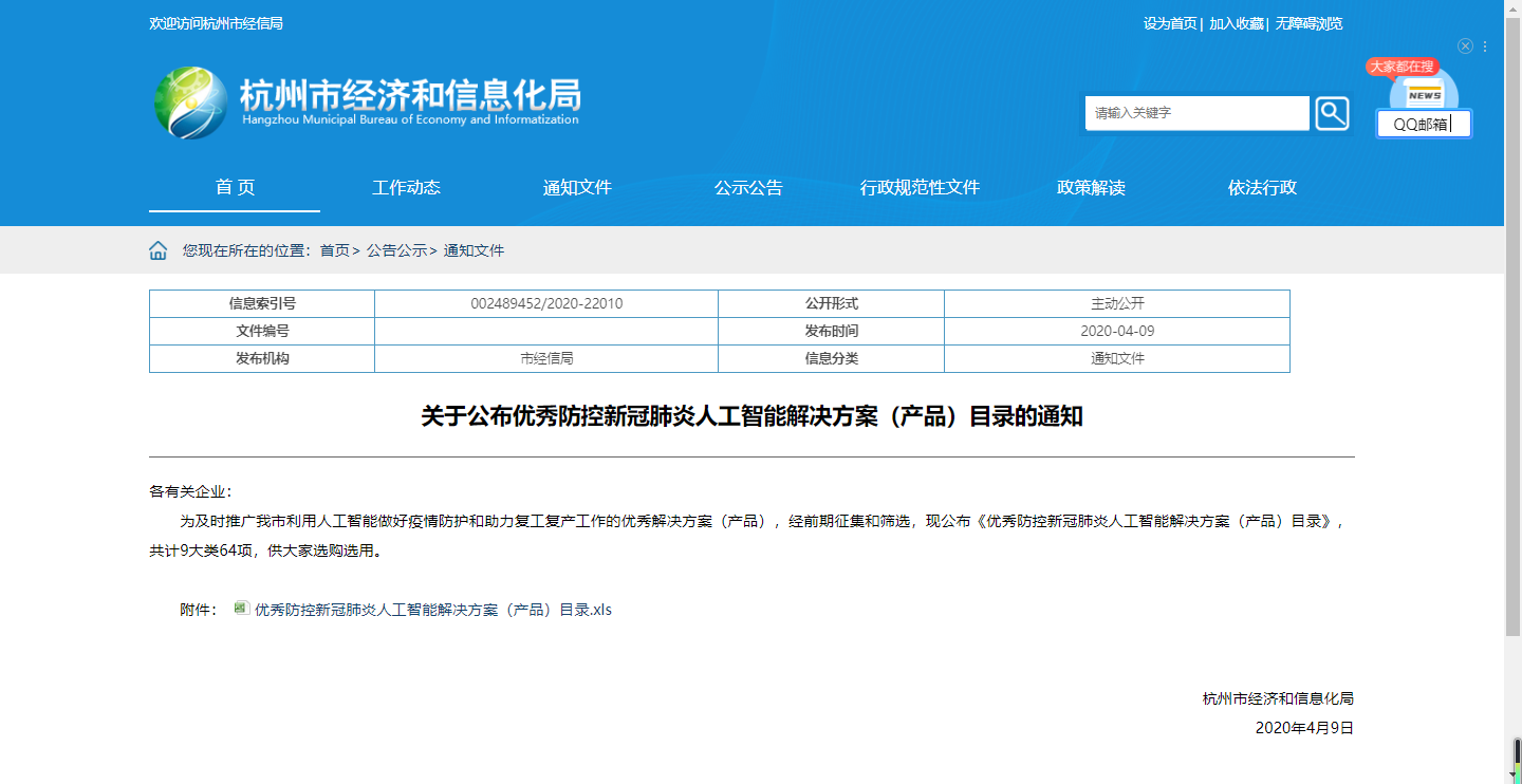 4月9日,杭州市经济和信息化局发布《关于公布优秀防控新冠肺炎人工智能解决方案(产品)目录的通知》。通知中指出为及时推广我市利用人工智能做好疫情防护和助力复工复产工作的优秀解决方案(产品),经前期征集和筛选,共计9大类64项入选该目录。其中,bbin宝盈城市大脑镇街智慧防疫解决方案入选AI+疫情防控类目,疫情防控交通AI保障平台入选AI+交通类目。